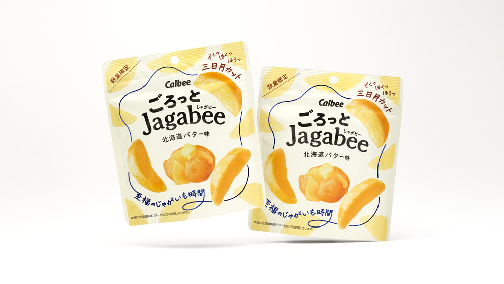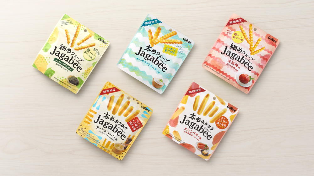 じゃがいもの素材そのもののおいしさにこだわったJagabeeブランドの期間限定品をデザインしました。ブランドの世界観を踏襲しながら、期間限定品として店頭を彩る顔つきを目指しました。