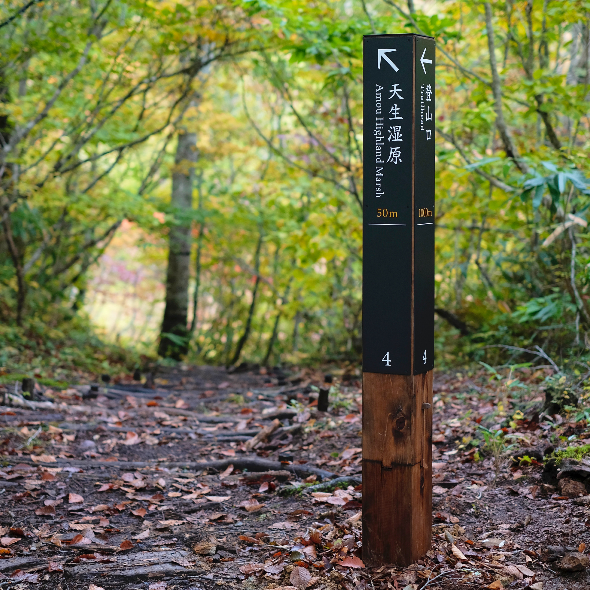 We developed a signage system for Amou Prefectural Natural Park, located deep in the mountains of Hida City, Gifu Prefecture. The design aims to guide visitors safely along complex mountain trails while conveying the relationship between people and the forest. The sign bodies combine locally sourced hinoki cypress with aluminum panels finished in a gray tone subtly infused with blue-green, ensuring legibility while harmonizing with the landscape. Kaisho-style Japanese typeface is used for the display, reflecting the history of this forest associated with the legend of the birth of the “Hida no Takumi” master craftsmen.