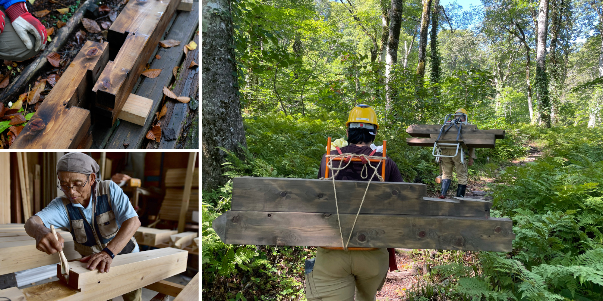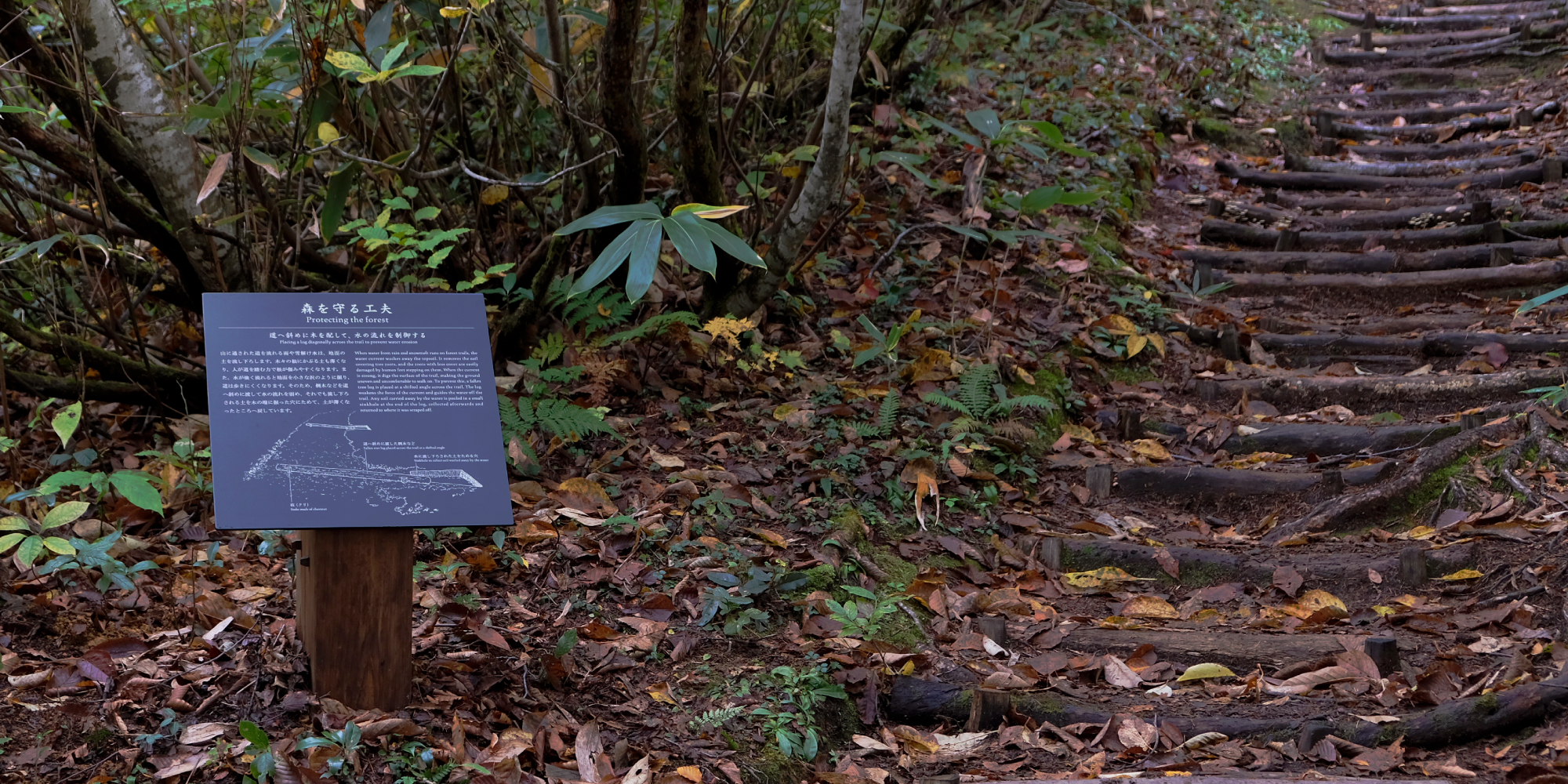 また「熊に注意」などの注意喚起や、森を守る監視員の工夫を伝えるサインを点在させることで、来訪者に人が自然に入る意味や人と森の関係性を伝えています。サインの設えには飛騨の組木技術を活用し、パーツ化することで人の手による運搬と現地組立を可能としました。これにより環境負荷を抑えるとともに、部材単位での交換による持続的な維持管理を実現しています。さらに木酢液の塗布により、風化や獣害への対策と景観への調和を両立しました。行政と民間の連携のもと、地域の木の文化と技術を継承する仕組みを内包した本計画は、サインを単なる情報伝達にとどめず、人と自然、地域文化をつなぐ存在として位置づけています。