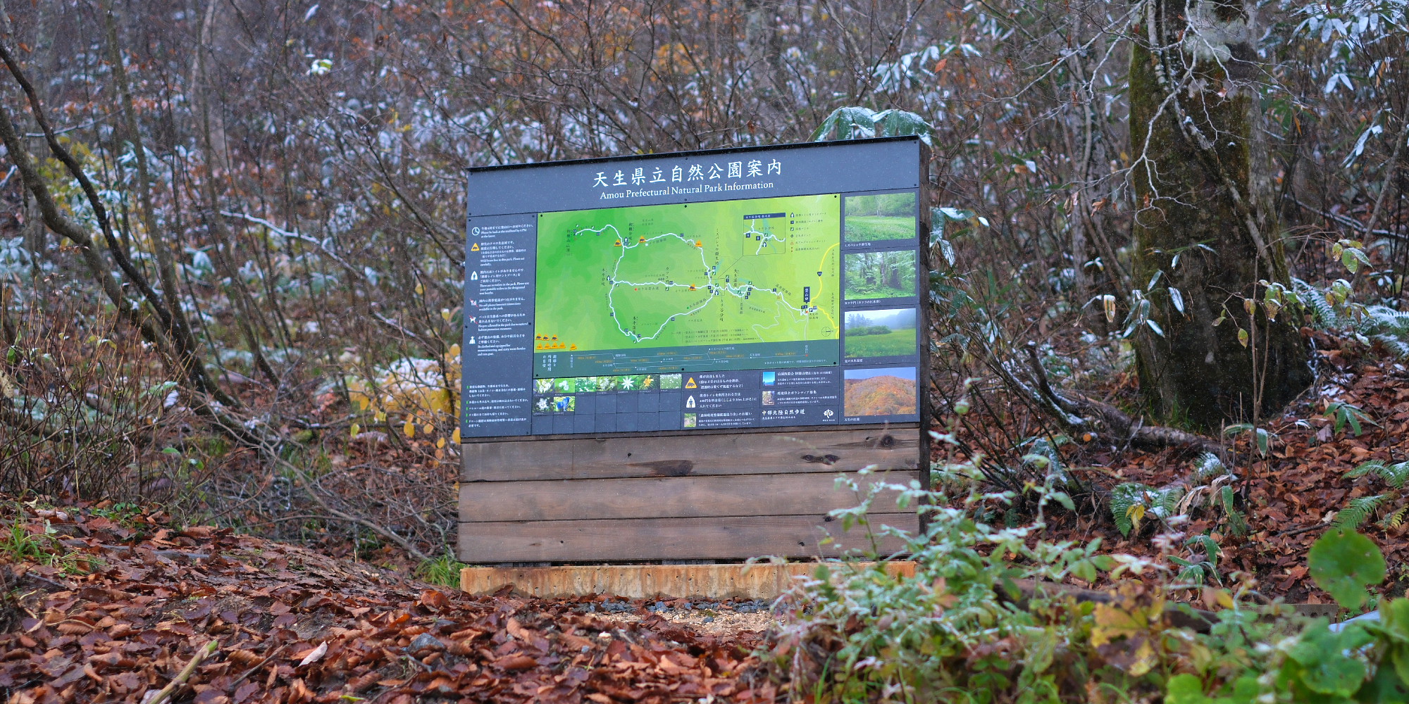 岐阜県飛騨市の深い山中にある天生県立自然公園のサイン計画を行いました。複雑な山道において来訪者を安全に誘導しながら、森と人のつながりを伝えることを意図しています。サイン本体には地元檜材と、僅かに青緑色を加えたグレーのアルミパネルを用い、景観と調和しつつ情報の視認性を確保しました。表示には楷書体を採用し、「飛騨の匠」生誕伝説のあるこの森の歴史を反映しています。
